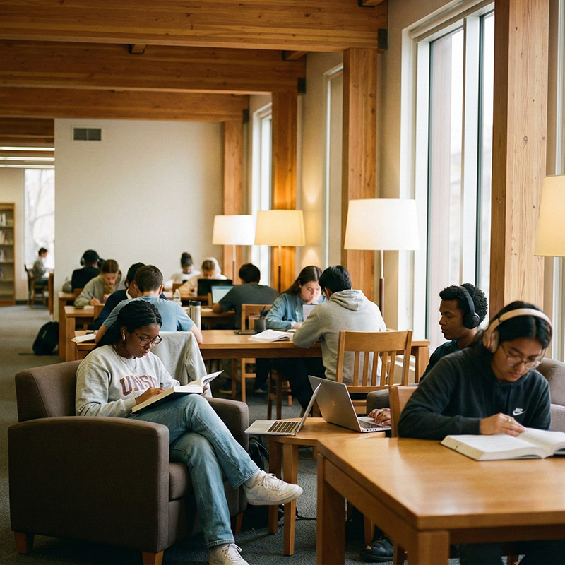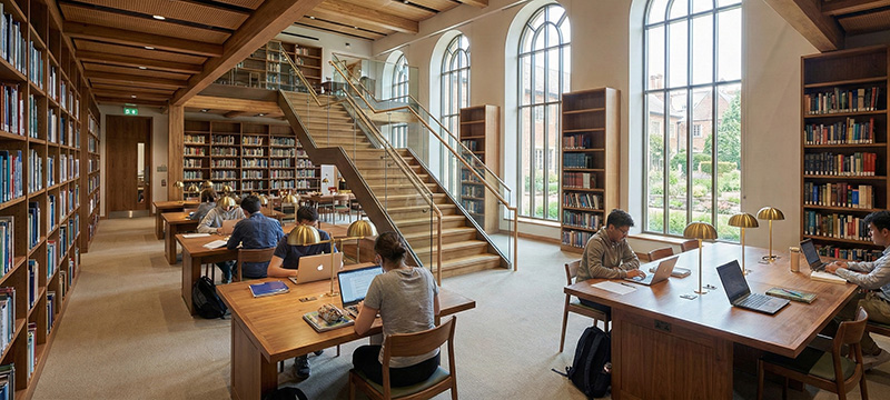 A three-story knowledge sanctuary with over 50,000 volumes, digital resource access, silent study zones, and group collaboration rooms — open until midnight daily.