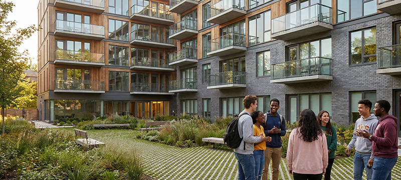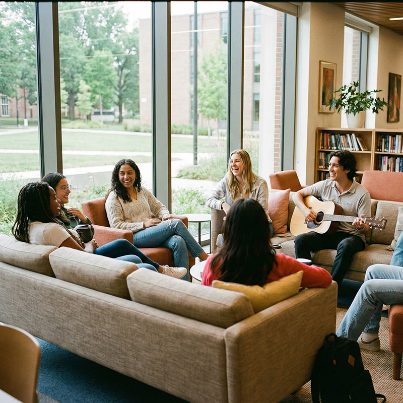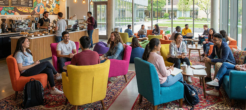 The social heart of campus — housing the student café, club meeting rooms, event spaces, and a wellness lounge for relaxation and peer support.