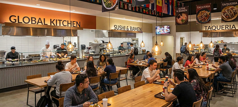 A vibrant dining venue offering diverse cuisines — from Central Asian classics to international options, with vegetarian, halal, and allergy-conscious menus.